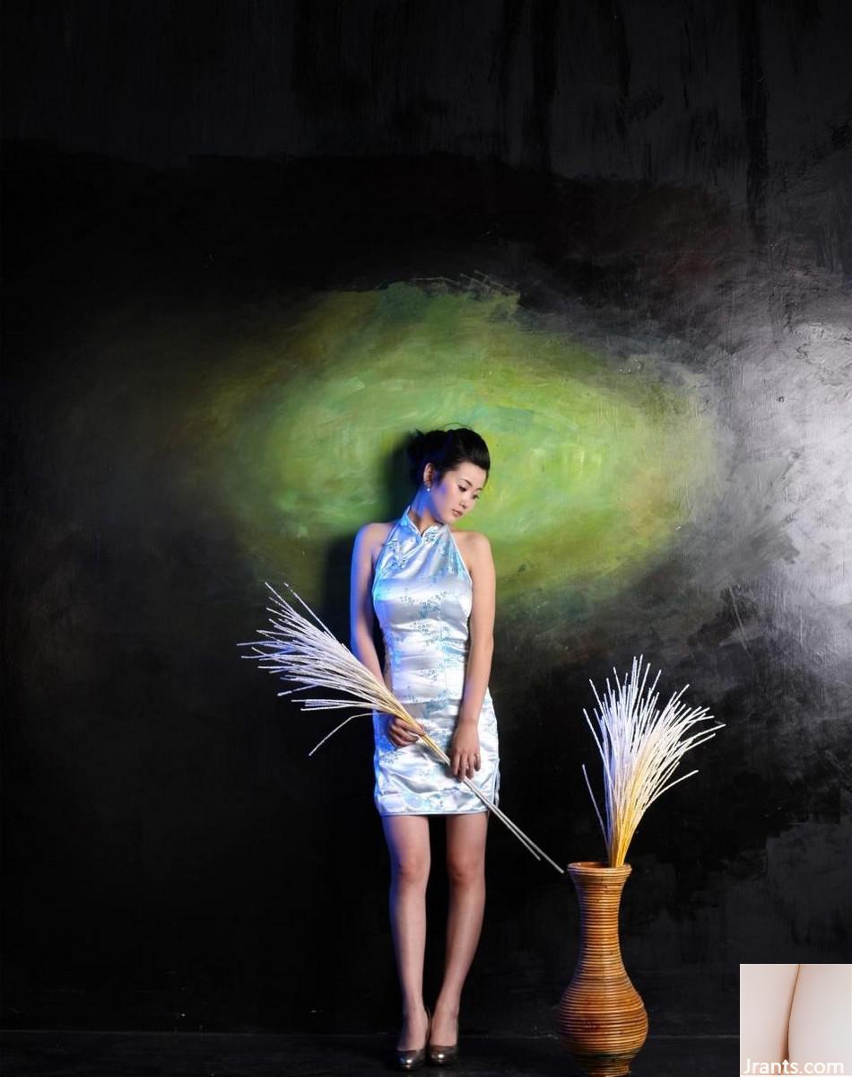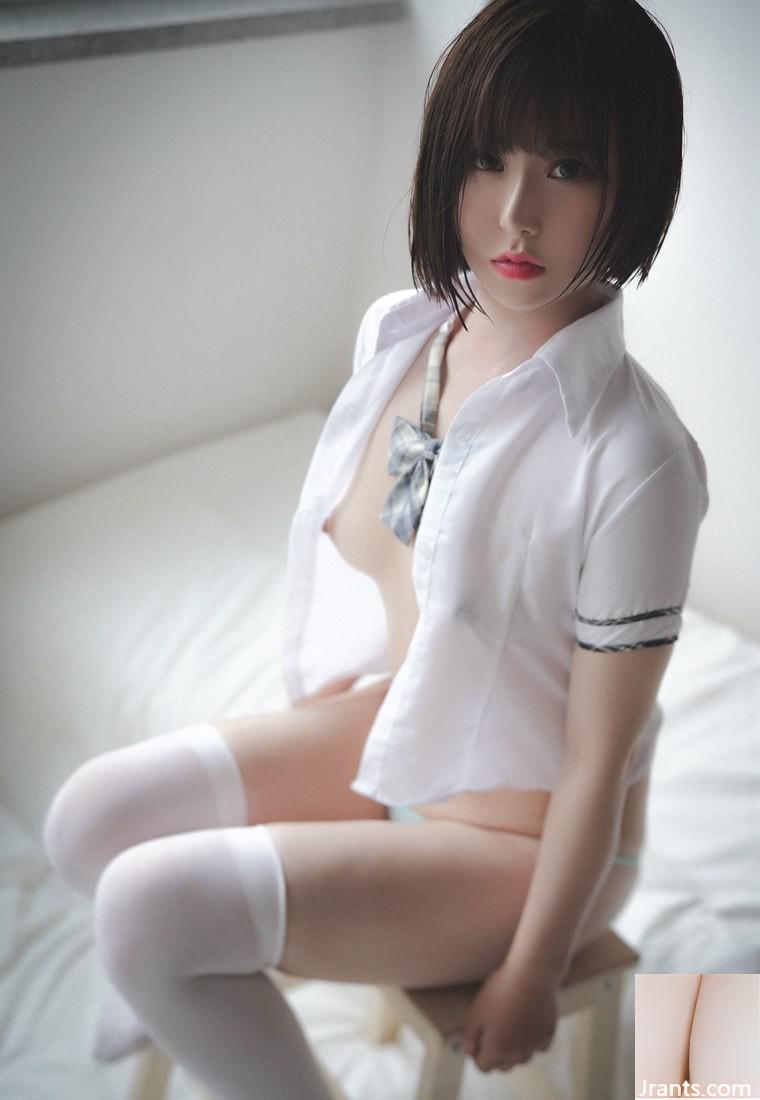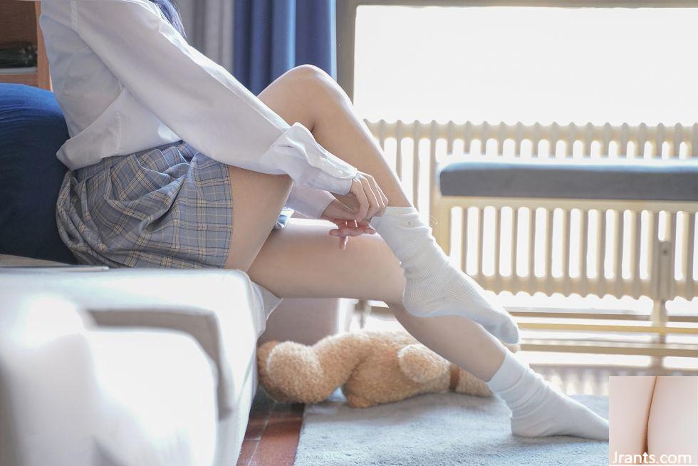 صورة مثيرة لسيدة جميلة ترتدي قميصًا أبيض وتظهر ساقيها الجميلتين في تنورة زرقاء منقوشة وجوارب بيضاء في غرفتها الخاصة (43P) 12 مارس، 2024